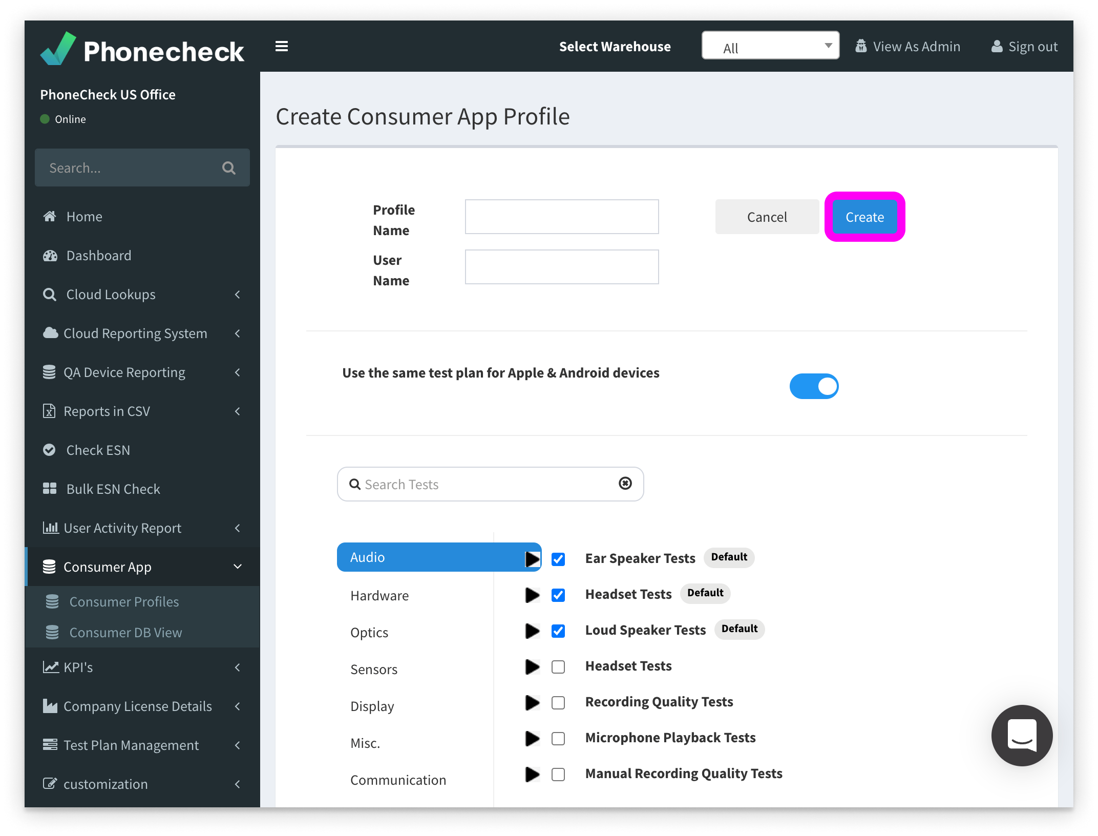 The consumer app allows consumers to test devices for functionality and provides those results to your Cloud without the device physically